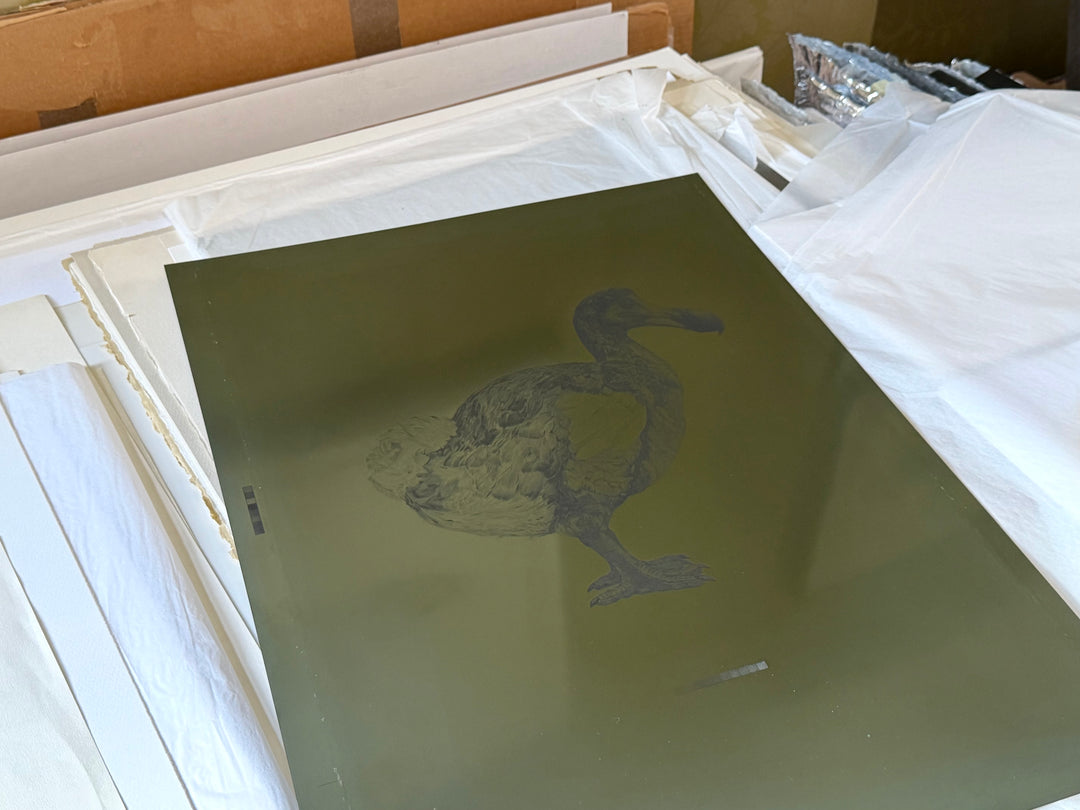 Tammy’s dodo prints are deeply personal, the earliest iterations were linked to family histories of loss - deaths in Burma and the Boer War. The extinct bird became a symbol not only of personal grief, but of historical erasure: the stories, archives and knowledge that disappear when people die. “You lose more than the person,” she reflects. Tammy’s work explores the idea that people take their stories with them.