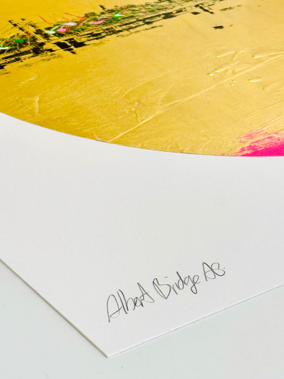 MEDiUM: Silkscreen hand-finished with gold leaf, pink spray paint, pen, ink and oils