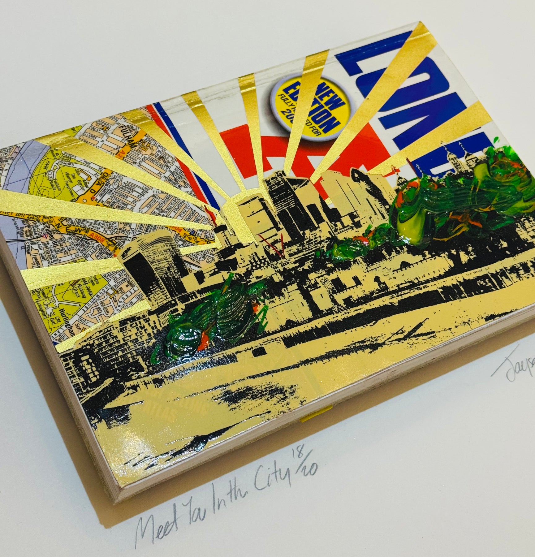 MEDiUM: Screen print on Vintage London A-Z with gold ink and oils